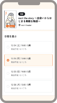recriがご提案するおすすめ作品の中から、観たい作品・日時・枚数を選ぶと、チケットがご自宅に届きます。